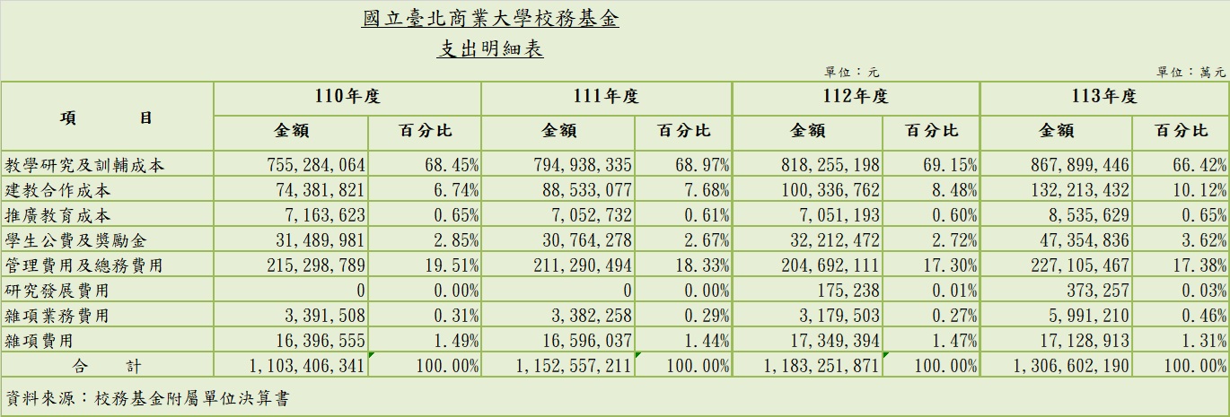 國立臺北商業大學校務基金支出明細表(單位:萬元)