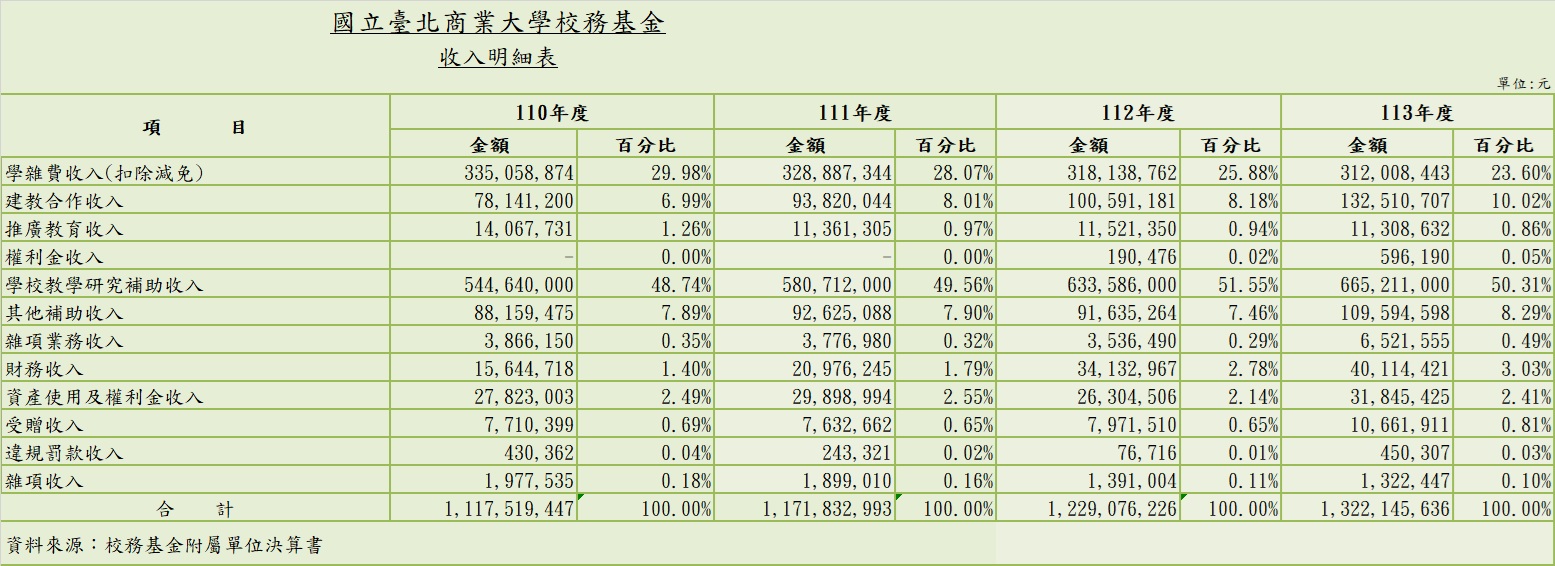 國立臺北商業大學校務基金收入明細表(單位:萬元)