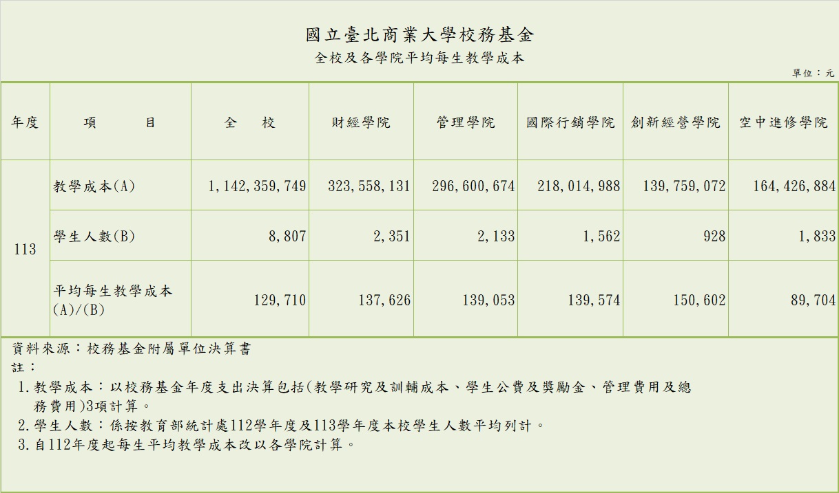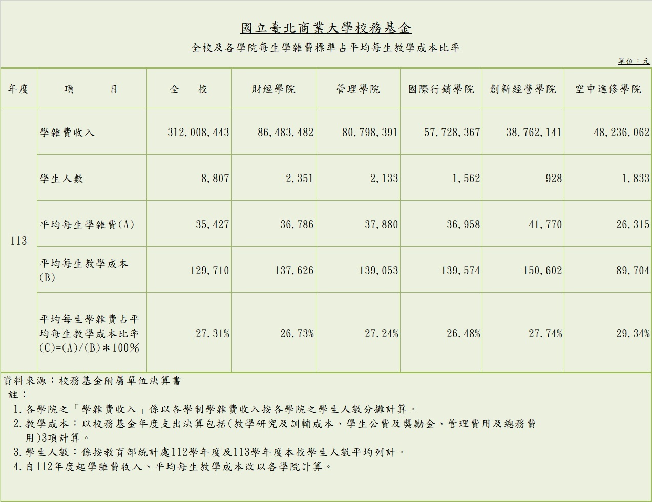 國立臺北商業大學校務基金學校及各附設學制每生平均教學成本(單位:萬元)