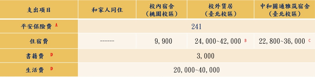 B:以在本校鄰近校外賃居學生登入之雅房金額資料(不含水、電及網路費)為例,校外賃居每月約4,000~7,000租金*6個月。